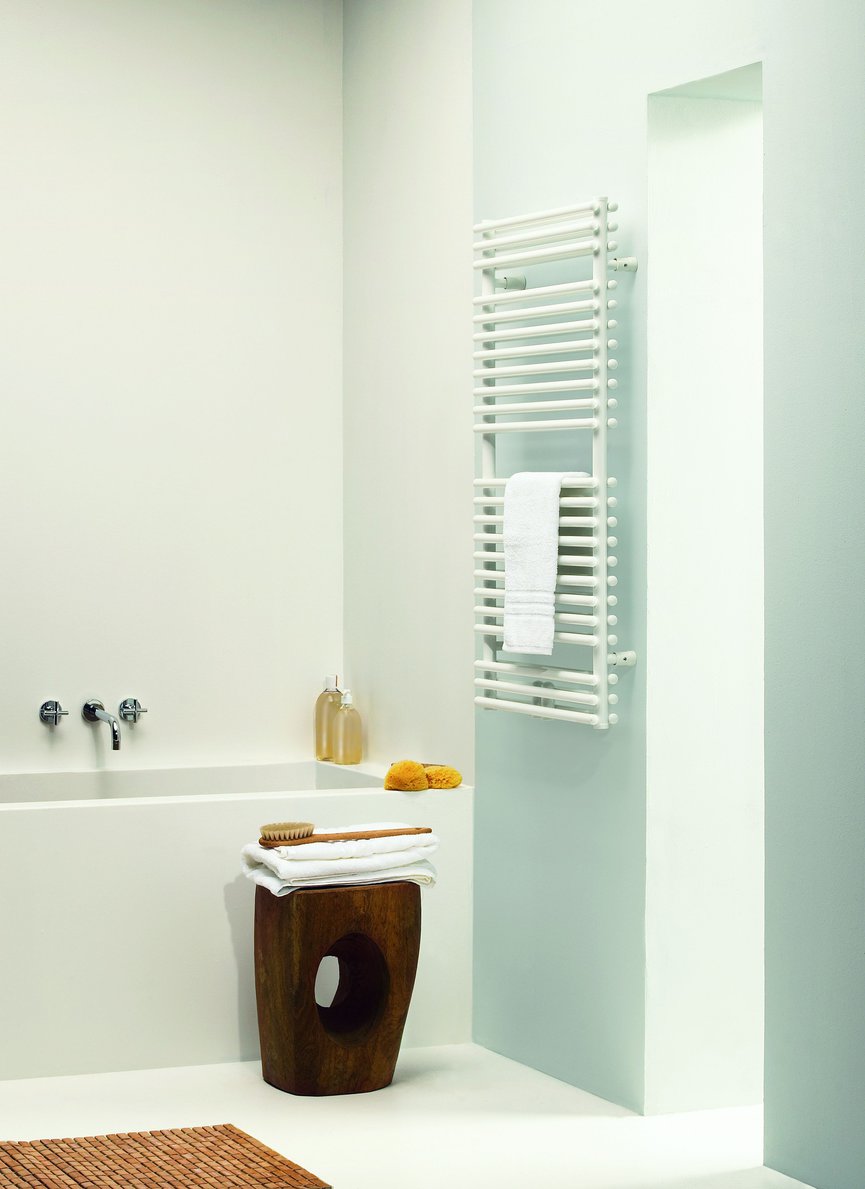W przypadku, gdy możemy pozwolić sobie na instalację grzejnika w kuchni, bardzo praktycznym wyborem jest grzejnik łazienkowy, np. Apia marki Purmo. Model wyróżnia się symetryczną formą, a dzięki wysokiej mocy grzewczej i drabinkowej konstrukcji doskonale sprawdzi się jako suszarka na ręczniki i ściereczki. Apia nie zajmuje wiele miejsca na ścianie, dostępna jest w czterech długościach (500, 600, 750 i 900 mm) oraz dwóch wysokościach (1134 i 1764 mm), a dodatkowe akcesoria w postaci wieszaków podnoszą jej funkcjonalność.