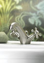 Ornamenty kwiatowe są również mocno wyeksponowane w baterii wannowej Tulipa. Patrząc na zwężające lub rozszerzające się linie oczami wyobraźni możemy zobaczyć łodygi lub liście. A czyż pręciki kwiatu tulipana przypadkiem nie zostały zaczarowane w pokrętła ozdobione czterema kuleczkami? W łazience gdzie ”rosną„ tulipanowe baterie wyobraźnia płata nam figle.