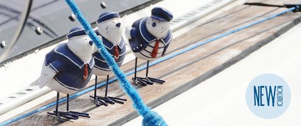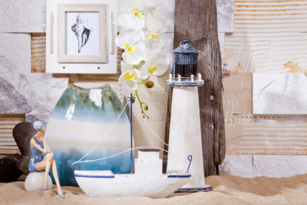 Nasz salon z powodzeniem ożywią figurki kojarzące się z dalekimi morskimi podróżami – statek oraz urocze ptaszki-marynarze. Wystrój dopełnią lampiony: w kształcie latarni morskiej, z morskimi muszelkami lub w formie turkusowej butelki. Czas do urlopu pomoże odmierzyć zegar ze  statkiem na tarczy,  a wakacyjne wspomnienia zatrzyma na dłużej ramka ozdobiona liną.