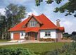 Mieszko. Dom z poddaszem użytkowym niepodpiwniczony przeznaczony dla 4-5 osobowej rodziny. Bryła domu oparta jest na prostokątnym planie a jego niecodzienny charakter uzyskano dzięki rozrzeźbieniu dachu. Na parterze oprócz części dziennej przewidziano sypialnię rodziców z łazienką. Na parterze można powiększyć pokój dzienny likwidując ścianę gabinetu.