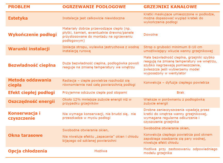 Zarówno wodne ogrzewanie podłogowe, jak i grzejniki kanałowe mają swoje wady i zalety. W zależności od preferencji i planów związanych z wykończeniem wnętrza, można zastosować jedno z tych dwóch rozwiązań lub połączyć oba w jednej instalacji. Często stosowanym rozwiązaniem jest układ z wykorzystaniem podłogówki w części wykończonej terakotą (przedpokój, kuchnia) oraz grzejników kanałowych w części wykończonej drewnem (jadalnia i salon). Warto skorzystać z oferty producenta ogrzewania, który kompleksowo oferuje wszystkie elementy systemu i obejmuje je wspólną gwarancją.