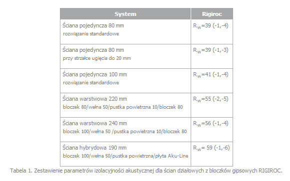 Ściany z bloczków Rigiroc zostały przebadane przez Laboratorium Akustyczne Instytutu Techniki Budowlanej pod względem parametrów akustycznych, dla różnych systemów przegród. Podstawowa i najczęściej stosowana konfiguracja to ściana pojedyncza wykonana z bloczków o grubości 8 cm połączona z posadzką przy pomocy taśmy bitumicznej, ze ścianami bocznymi i stropem u góry, dla strzałki ugięcia stropu do 4 mm, za pomocą przekładki korkowej . Dla tej ściany uzyskano wartość Rw(c,ctr) = 39 (-1,-4) dB. Dodatkowo zostało przeprowadzone badanie ściany z bloczków 80 mm, w której górne połączenie ze stropem zostało wykonane przy pomocy pianki poliuretanowej o parametrze RSTW = 58dB – rozwiązanie zalecane w przypadku gdy ścianka ugięcia dochodzi do 20 mm. W tym przypadku izolacyjność akustyczna wynosi Rw(c,ctr) = 39 (-1,-3) dB. Należy tutaj dodać, że Rigips, jako jedyny producent bloczków gipsowych w Polsce proponuje takie rozwiązanie, popierając to odpowiednimi raportami z badań, potwierdzających spełnienie wymogów izolacyjności akustycznej. Dla ściany pojedynczej z bloczków Rigiroc 100 mm wykończonej w sposób standardowy izolacyjność akustyczna wynosi Rw(c,ctr) = 41(-1,-4) dB. Ściany z bloczków gipsowych mogą być wykorzystywane również jako ściany międzylokalowe. W takich przypadkach stosuje się ściany warstwowe. Najprostszym rozwiązaniem w tym zakresie są ściany zbudowane z dwóch ścian pojedynczych 80 mm pomiędzy którymi znajduje się wełna mineralna o grubości 50 mm i pustka powietrzna 10 mm. Taka ściana charakteryzuje się parametrem Rw(c,ctr) = 55 (-2,-5) dB . Jeśli przeznaczenie budynku wymaga izolacyjności na wyższym poziomie, wówczas możliwe jest zastosowanie ściany warstwowej niesymetrycznej składającej się ze ścian z bloczków o grubościach 80 z jednej i 100 z drugiej strony z wełną i pustką powietrzną pomiędzy nimi. Parametr Rw dla takiej ściany wynosi 56 (-1,-4) dB.