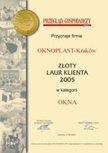 W organizowanym przez "Przegląd Gospodarczy" konkursie OKNOPLAST - Kraków został wyróżniony "Złotym Laurem Klienta 2005". Instytut Gallupa który sprawuje opiekę merytoryczną nad przedsięwzięciem czuwał nad skrupulatnością przeprowadzonych badań.