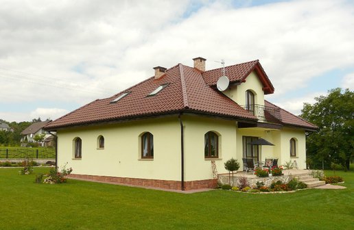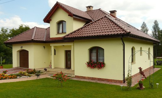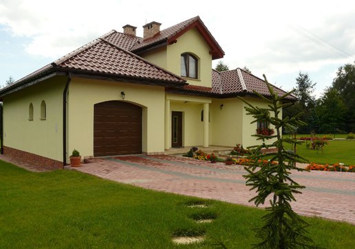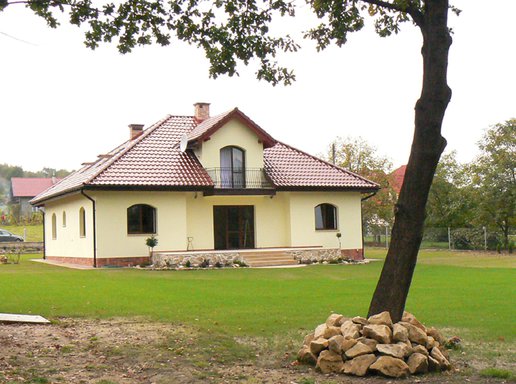 Wiatrołap, hol, salon i kuchnia są pokryte płytkami z ogrzewaniem podłogowym - całą zimę można chodzić boso, a pokoje na parterze wyłożone zostały parkietem dębowym - dużą klepką. Okna są takie jak w projekcie, bo dom straciłby wiele przy zmianie na okna prostokątne czy kwadratowe (…)."