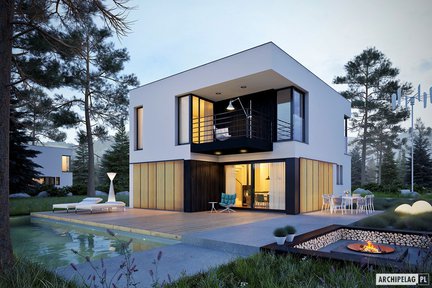 Nowoczesny dom kostka – piętrowy z płaskim dachem, zachwyca zarówno swoim wyglądem zewnętrznym, jak i funkcjonalnie rozplanowaną przestrzenią w środku. 125 m2 pozbawione skosów można w pełni wykorzystać na cele mieszkalne. Dużym plusem projektu są szerokie przeszklenia, które otwierają wnętrze na ogród. Taras okalający dom i uroczy balkon na piętrze to dodatkowe atuty, dzięki którym codzienne użytkowanie domu jest niezwykle wygodne i przyjemne. W tym projekcie domu zaplanowano energooszczędne instalacje: pompę ciepła, wentylację mechaniczną z rekuperacją i panele fotowoltaiczne.